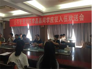 欢送会由孙立明老师主持召开。会议伊始,16级辅导员王梓懿老师向大家介绍了历届大学生应征入伍的基本情况,表示李晶晶同学是学院第一名应征入伍的女同学。然后,劳保1601班李晶晶同学进行了发言,她先表达了对到场的同学和老师的感谢,感谢学院的培养,她也表达出自己的不舍之情。接着,退伍复学的吴建同学和蒋彦鹏同学以自己的经历和经验谈论了军旅生涯,他们嘱咐她要做好吃苦耐劳的心理准备。李晶晶同学的班导师随后也表达了自己的良好祝愿。劳保1601班的班级代表回顾了他们两年的同窗生活,并为李晶晶同学的选择感到骄傲,发言完毕,现场同学和老师潸然泪下,班级还赠送了一支钢笔作为礼物,祝愿她携笔从戎展壮志。随后,周谨平副院长为即将入伍的李晶晶同学戴花,姜国俊副院长进行了发言,首先他代表学院送上了礼物——一个印有院训的笔筒,希望李晶晶同学在外不忘自己中南公管人的身份,真正做到“仰不愧天,俯不怍人”,学校和学院永远是她最坚实的后盾,最后祝愿李晶晶同学军旅生活一切顺利,不忘初心,获得成长,期待两年后与李晶晶同学的重逢。会议结束后,与会的全体老师和同学留下了珍贵的合影纪念。