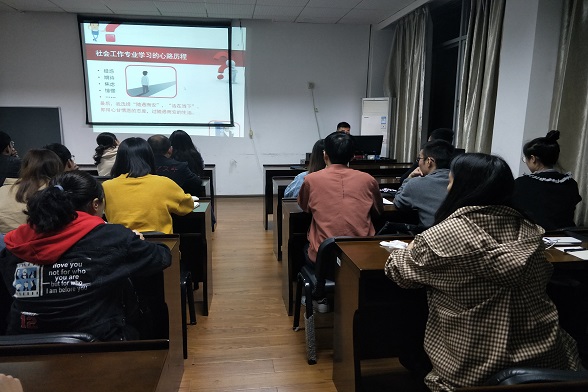 葛军伟学长本科和研究生所学专业均是社会工作。先是分享自己专业学习的心路历程,对社工从疑惑到期待到焦虑再到憧憬的过程。接着是社会工作从业经历分享,列举了几个自己参与的项目和同学们分享了项目管理、项目设计等实务性知识,还通过一些社工在实物过程中遇到的伦理困境案例和大家做经验交流,提出社工的专业性就是和服务对象建立专业关系,在建立专业关系的时候要注意专业关系的长度,把握专业关系的弹性和刚性。再次,葛军伟学长和大家探讨了社会工作者职业耗竭及自己的反思,通过他的调查分析,工作环境、机构归属感和同事朋友支持是社会工作者职业耗竭的显著影响因素。最后他认为社会工作者的职业发展前景是好的,现阶段国家层面是越来越重视社会工作的发展。最后以几个社会工作创新服务模式的案例,提出了自己对社会工作者的理解,即社会工作者,是阳关成长下的一份职业。