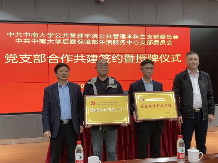 首先进行了授牌仪式,在学院党委耿贵斌副书记致辞、后勤保障部李建国副部长讲话后,两支部签订了共建协议,互赠“党建合作共建单位”牌,并由公共管理本科生党支部书记和生活服务中心党支部书记分别表态发言。