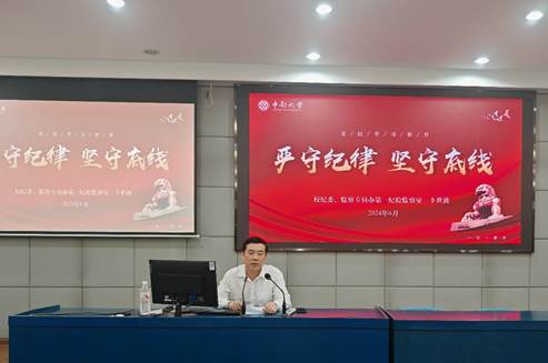 为落实学校纪委“一院一宣讲”及党纪学习教育工作安排,实现纪律教育对教职员工的全覆盖,营造风清气正的学院氛围。6月19日下午,校纪检监察机构第一纪检监察室主任卜世波在公管楼404报告厅作了题为“严守纪律,坚守底线”的廉洁教育专题宣讲,学院党政班子成员、全体教职工党员参加了会议,会议由院党委副书记、纪检委员耿贵斌主持。