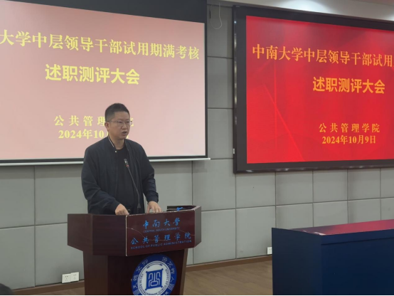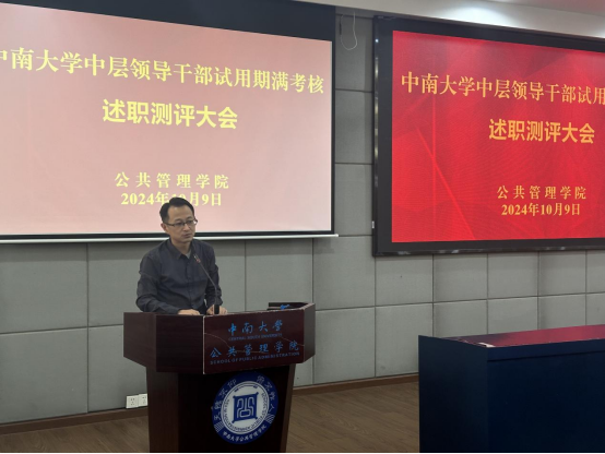 10月9日下午,我院在公管楼404会议室召开中南大学中层领导干部试用期满考核述职测评会议,对副院长李晓飞进行试用期满考核述职测评。中南大学党委组织部正处级组织员凌春雨,党委组织部副部长穆克朗,党委组织部正科级干事朱以东,党委组织部副科级干事刘世宏,yl23455永利官网全体领导班子成员及全体教职工参加会议。会议由学院党委书记杨旭东主持。凌春雨首先介绍了试用期满考核工作的背景并代表学校党委组织部对全体参会人员的支持表示感谢。随后,他介绍了民主测评工作的流程与要求并希望全体参会人员以高度负责、客观公正、实事求是的态度,独立对考核对象作出评价,正确行使民主权利,确保考核结果反映真实情况。