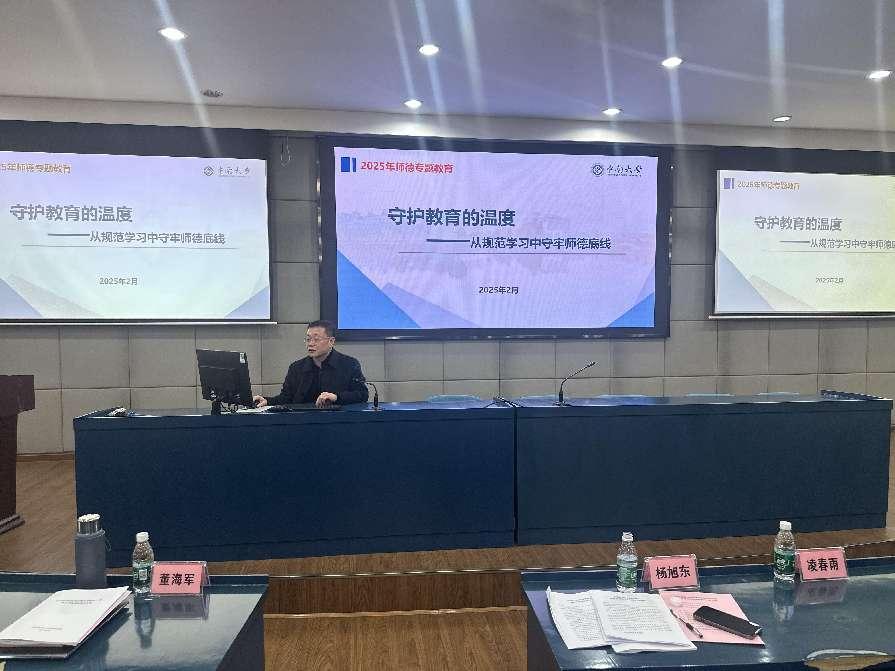 杨旭东以“守护教育的温度——从规范学习中守牢师德底线”为题,为全院教职工讲授2025年师德师风第一课。他重申好老师的标准,组织《新时代高校教师职业行为十项准则》进行再学习,传达违反师德师风的典型案例,与每一位老师共勉要秉持着热爱教育的定力和淡泊名利的坚守。