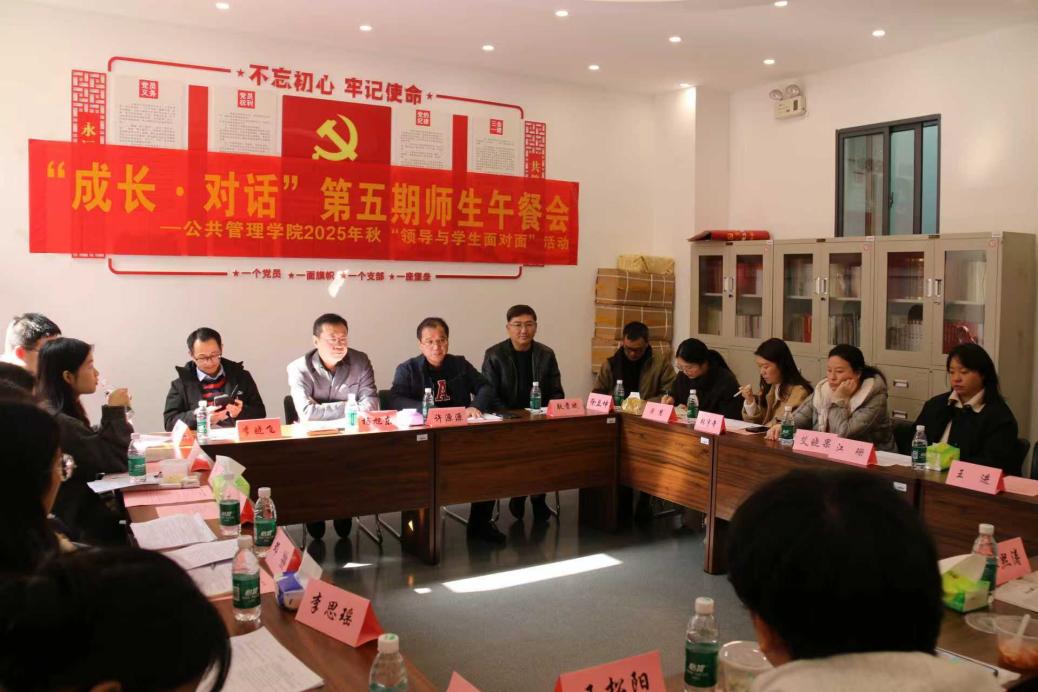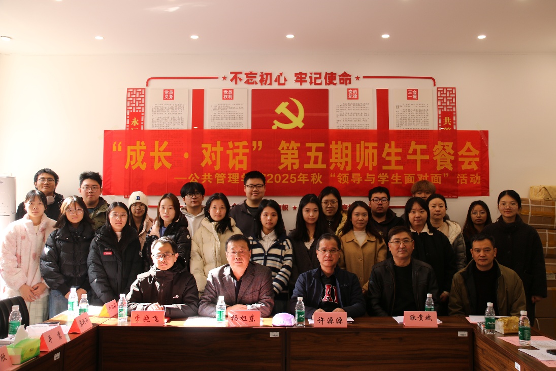 12月25日中午12时,我院第五期“成长·对话”师生午餐会在公管院楼310教室举行。学院领导杨旭东、许源源、耿贵斌、李晓飞,学工办辅导员、教务办、实验室教师代表11人,和本硕博不同专业学生代表12人共话成长。