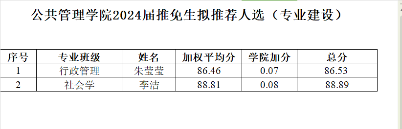 根据学校、学院2024届推免工作相关通知要求,为支持“双一流”学科专业、国家一流本科专业及省级基础学科基基地建设,现增加我院社会学专业、行政管理专业各一个推免指标,现将增补推免生拟推荐人选公示如下。