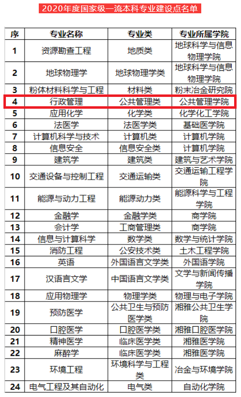 中南大学行政管理专业涵盖公共政策、城市治理、应急管理和健康治理4个专业方向,拥有以教育部新世纪优秀人才、湖南省青年骨干教师、宝钢优秀教师为代表的教学团队,以及全国教育系统社会稳定风险研究评估中心、中国智库索引(CTTI)来源智库等中心和机构,与省教育厅共建“湖南省教育系统重大事项社会稳定风险评估中心”,与教育部思政司共建“全国教育系统社会稳定风险研究评估中心”,成为中国应急管理学会校园安全专业委员会主任单位,连续五年编写并出版《中国应急教育与校园安全发展报告》,2019年获批湖南省社会科学普及基地,在地方治理、公共安全与风险治理等领域拥有明显学科特色和行业优势,为国家和地方治理培养了大批优秀人才。