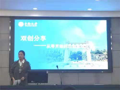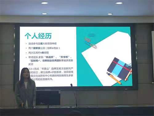 随后,三位优秀创新创业学生代表上台,结合PPT与同学们分享参与比赛后自己所获得的经验与方法。李紫茹同学立足于项目路演,详细解说了演示文稿、项目和团队三个要素王梦姿同学从自身从零开始的创业项目出发,阐明了动机、项目主题和项目策划与执行中需要关注点细节皮特同学结合自身案例谈到了团队组建等方面的注意事项,他建议大家可以跟随学长学姐们开展双创项目,甚至是继承已有的双创项目在此基础上开展相关研究。