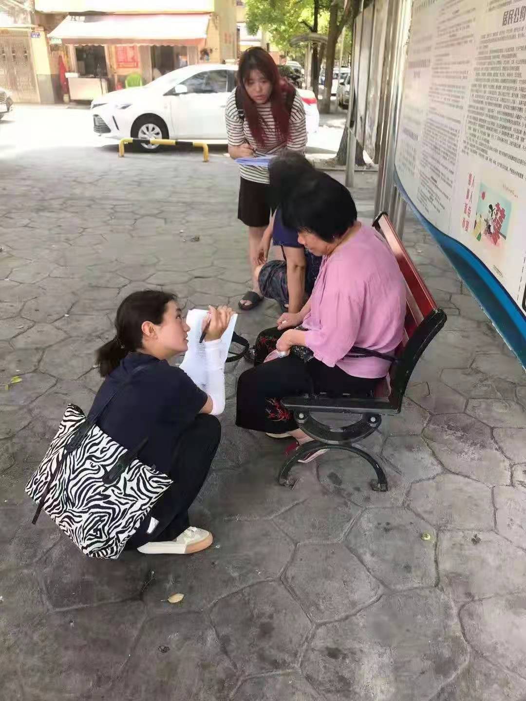 出发前,同学们相互之间提醒要带的物品,并约好集合的时间和地点,提前做好当天两两一组的分队工作,同时确定了当日所要完成的问卷目标数。到达社区后,各分小队依次进入不同的楼栋单元,对居民进行问卷调查。敲门——询问——访谈——记录,从瞻前顾后不敢行动到不断改善愈加熟练,每位同学逐渐结合实际,形成了建立信任、有效沟通与顺利访问的技巧与策略。在烈日下相互支持,在拒访中相互安慰。正是这艰辛的过程使得取得的成果更加弥足珍贵。