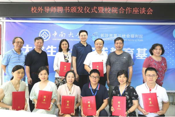 为进一步规范和深化中南大学与长沙市第三社会福利院的院校合作,7月7日在长沙市第三社会福利院,我院联合长沙市第三社会福利院举行校外实践教育基地校外导师聘书颁发仪式暨校院合作座谈会。本次活动由长沙市第三社会福利院沈雪芝副院长和我社会学系副主任颜敏副教授主持,长沙市第三社会福利院贺吉清院长、中南大学本科生院李国振主任、我院副院长董海军教授、中南大学教学督导李满春教授和陈立新副教授出席,校外兼职导师和2018级社会学系本科生参会。