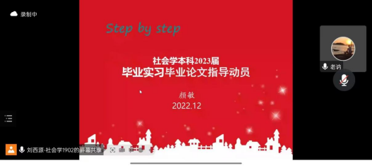 2022年12月27日下午,会学系通过线上会议的方式召开了2023届毕业论文辅导与毕业实习动员大会。副院长潘泽泉、社会学系副主任颜敏、社会学系各教师出席了会议,社会学系2019级的全体同学参加了会议。