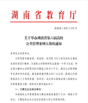 我院积极组织研究生参加由湖南省教育厅主办、湖南大学承办的“第六次高校公共管理案例”大赛。负责本次参赛队伍的选拔工作由学院公共管理学科及MPA教育管理中心共同组织。