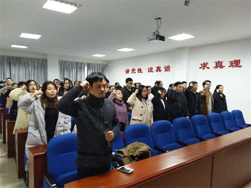 培训伊始,全体起立,奏唱国歌。紧接着,举行入党宣誓仪式。由徐立坤老师领誓,全体预备党员右手握拳举过肩头,面向鲜红的党旗,逐句庄严宣誓。宣誓完毕后,每位预备党员在党旗下拍照留念,记录这个神圣而庄严的时刻。铮铮誓言鉴我心,党徽辉耀党旗红。面对党旗进行入党宣誓,使预备党员们深刻体会到了责任和使命。通过入党宣誓,预备党员们也表明了自己自愿承担共产党人的政治责任,表明了对党事业的忠诚,督促自己始终牢记誓言,不忘初心,付诸行动!