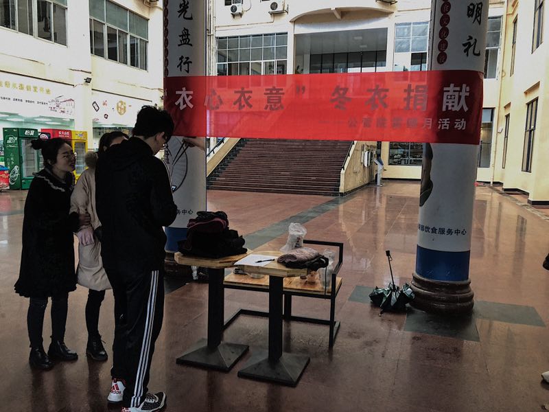 3月16日上午,在校本部三五食堂一楼广场,摆好桌子,开展冬衣捐赠活动的衣物收集环节。活动过程中,吸引了我院、粉冶院、资安院等全校各学院的同学踊跃捐献。捐献者将自己的衣物整齐地装在袋子里交到捐献处,爱心衣物在春季里交接,暖意在心中流动。一天时间里,我们收集了大大小小十几袋爱心衣物,并运到升华后楼711室暂时保管。