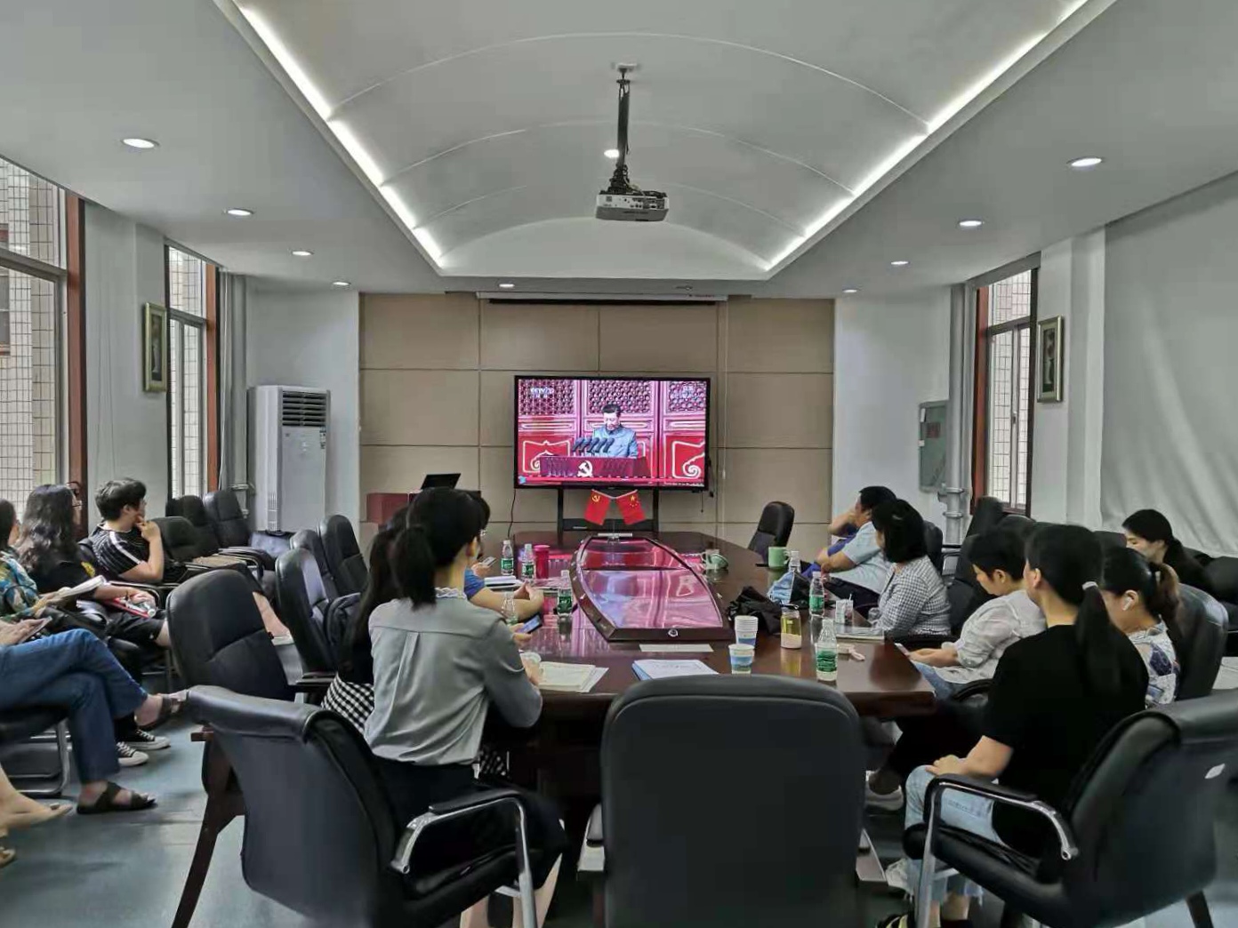 庆祝中国共产党成立100周年大会7月1日上午8时在北京天安门广场隆重举行。中共中央总书记、国家主席、中央军委主席习近平发表了重要讲话。学院党委组织院班子成员、党支部书记、机关党支部党员在学院楼209集中观看了大会直播,党支部组织党员通过电视、广播、网络等途径集中收听收看了大会盛况。