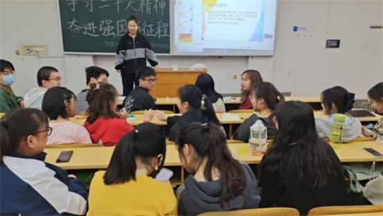 之后,团支书刘羽茜带领大家观看党的二十大相关视频,并对其相关知识进行讲解,使同学们对大会的主题、意义、使命等方面都有了更全面的理解。为了激发同学们学习党的二十大精神的热情,三个班级联合举行了党的二十大精神知识竞答比赛,大家踊跃参与,积极竞答,进一步加深了团员们对党的二十大精神的理解,纷纷表示此次活动收获甚多。