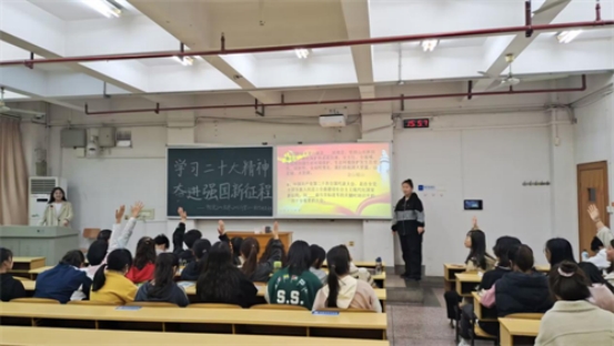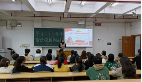 活动伊始,雷望红老师为大家详细讲述党的二十大精神。内容主要分为四个部分,第一部分主要介绍中国特色社会主义的内涵,并就什么是中国特色社会主义进行提问,多位同学积极发表意见;第二部分通过列举中南大学优秀党员何继善院士、湖南建工集团六公司施工技术员张珍的先进事迹,阐述优秀党员所具备的优秀品质及党的正义性;第三部分论及中国式现代化的道路自信;最后,她结合党的二十大精神,谈论中国广大青年的使命担当,号召青年大学生要有使命感和责任感,不负国家,不负人民。