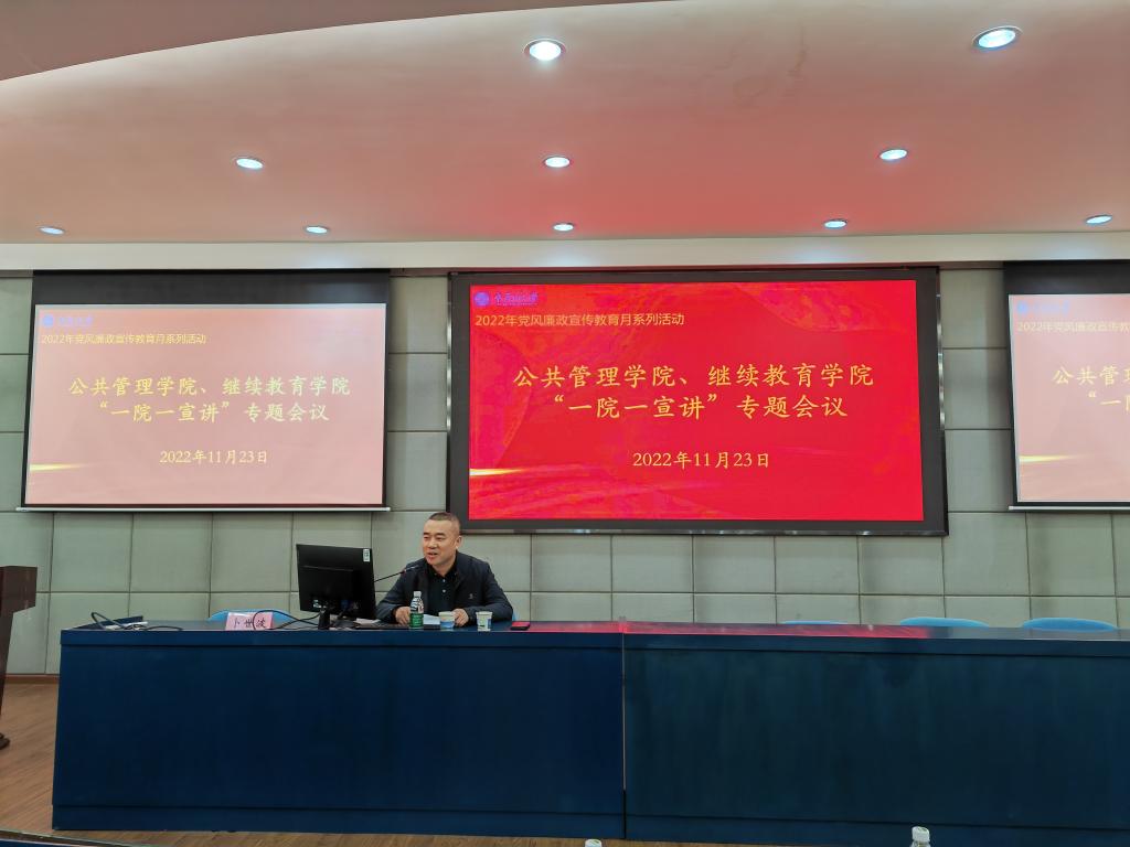 为进一步贯彻中共中央办公厅《关于加强新时代廉洁文化建设的意见》,落实学校纪委“一院一宣讲”及党风廉政宣传教育月工作安排,实现纪律教育对教职员工的全覆盖,营造风清气正的学院氛围。11月23日下午,校纪委副处级纪检员、第二纪检监察室主任卜世波在公管楼404报告厅作了题为“增强全面从严治党永远在路上的政治自觉,确保党不变质、不变色、不变味”的廉洁教育专题宣讲,yl23455永利官网和继续教育学院党政班子成员、全体教职工党员参加了会议,会议由yl23455永利官网党委副书记、纪检委员耿贵斌主持。