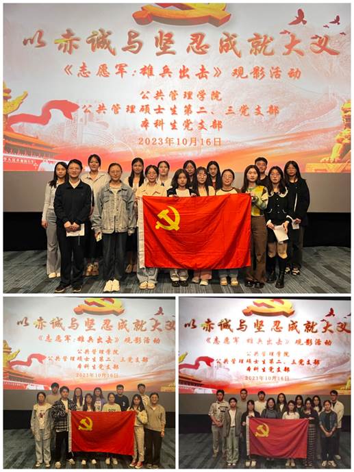 2023年10月16日晚,我院公共管理硕士生第二、三党支部与本科生党支部,联合组织40余名党员开展《志愿军:雄兵出击》观影活动,旨在深化党员对抗美援朝历史和革命大无畏主义精神的认识,铭记保家卫国的人民英雄,致敬以赤诚与坚忍成就大义的最可爱的人。