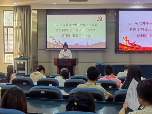 会上,支部书记赵利娟同志代表上一届支部委员会作《聚沙成塔,砥砺前行——为共筑高凝聚力学生党支部而不懈奋斗》的工作报告。报告全面回顾并总结了社会工作硕士生党支部近三年的党建工作,从组织建设、思想引领、社会实践及学习教育等方面进行了详细阐述,展现了全体党员团结一心、共同奋斗的精神风貌。