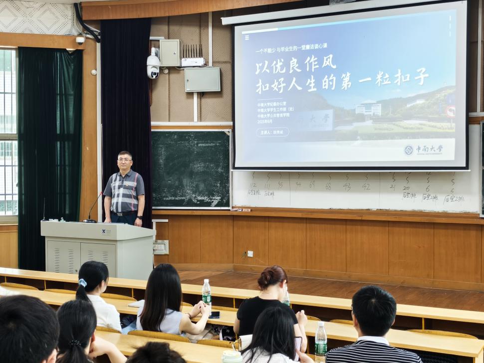 6月11日15时,在世纪楼B404,全体毕业生党员聆听了中央党校(国家行政学院)党的建设教研部副主任祝灵君教授主讲的《学习贯彻习近平总书记关于加强党的作风建设的重要论述和中央八项规定精神》主题授课,他深入解读习近平总书记关于作风建设的重要讲话精神,提醒大家自警自省,守住廉洁底线。