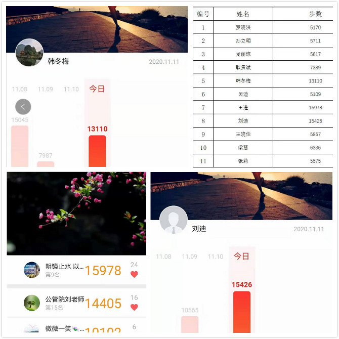 根据活动要求,在11日当天完成一次跑步或健步走,最低步数5000步,距离不设上限,速度不做要求。我院教职工纷纷以实际步数响应活动号召,使用手机APP记录步数,共有80人截图报至我院工会文体委员王进老师处。