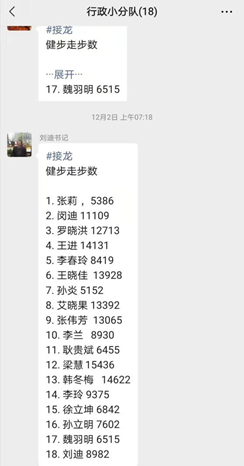 活动要求在12月1日当天,教职工自主选择场地完成一次健步走,最低步数5000步,距离不设上限,速度不做要求。截至12月1日晚24点,我院共95名教职工通过群接龙,步数截图等方式晒出实际步数,响应活动号召。