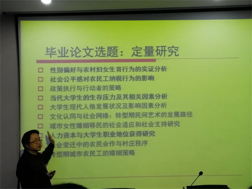 颜老师首先向同学们强调了毕业论文和毕业实习的重要性,并对同学们大四阶段的学习和生活提出了要求和展望。会议内容分为两个部分,第一部分是由潘泽泉老师主讲的毕业论文写作辅导讲座。潘老师从不同的研究范式出发,分别为同学们讲解了定量研究、质性研究和理论研究的写作方法和研究框架。另外,通过回顾往届毕业生的论文选题,潘老师对同学们的毕业论文提出了更加细致的要求和注意事项,这对于正处在选题阶段的毕业生来说如雪中送炭。