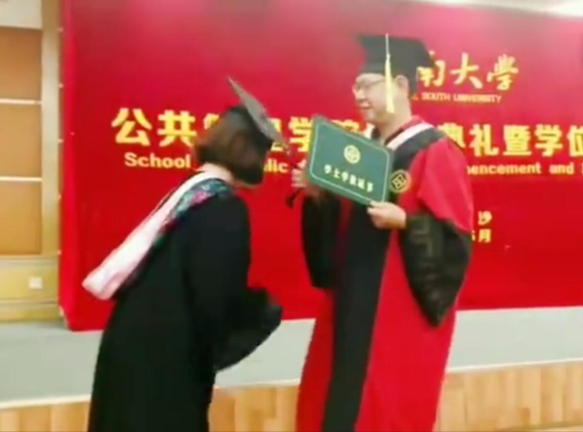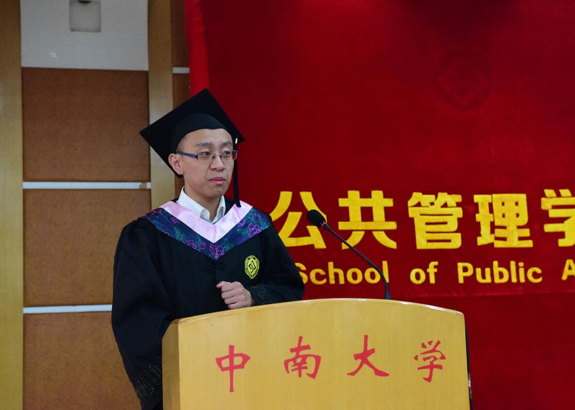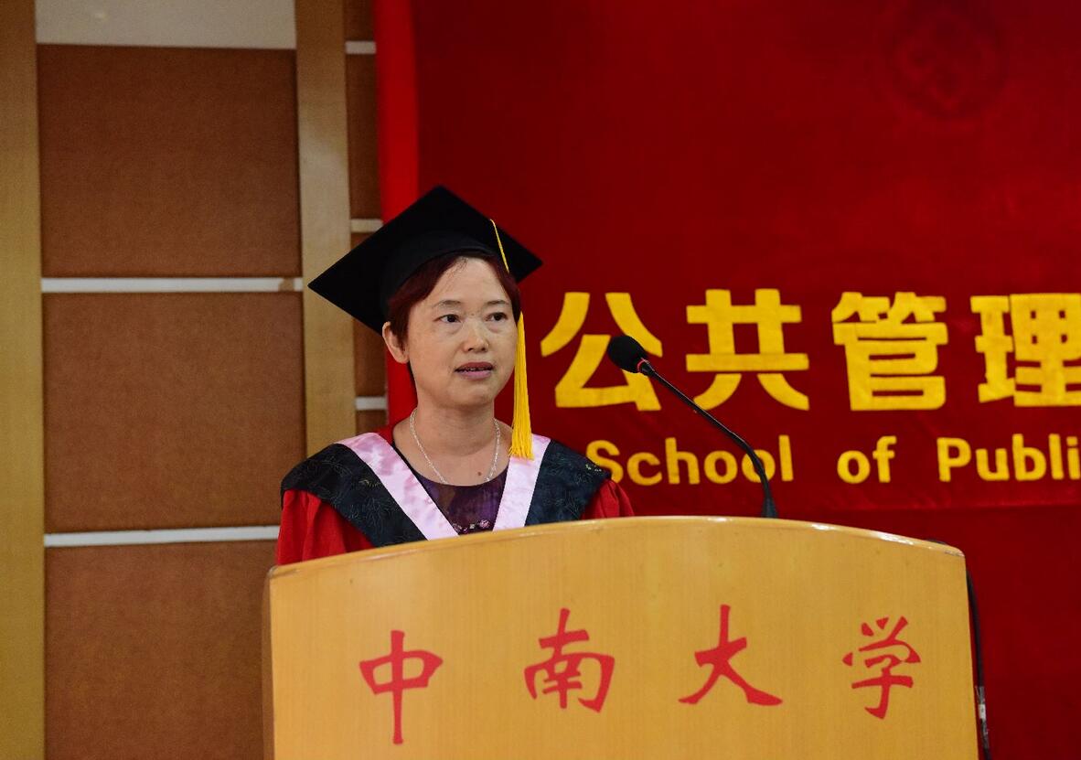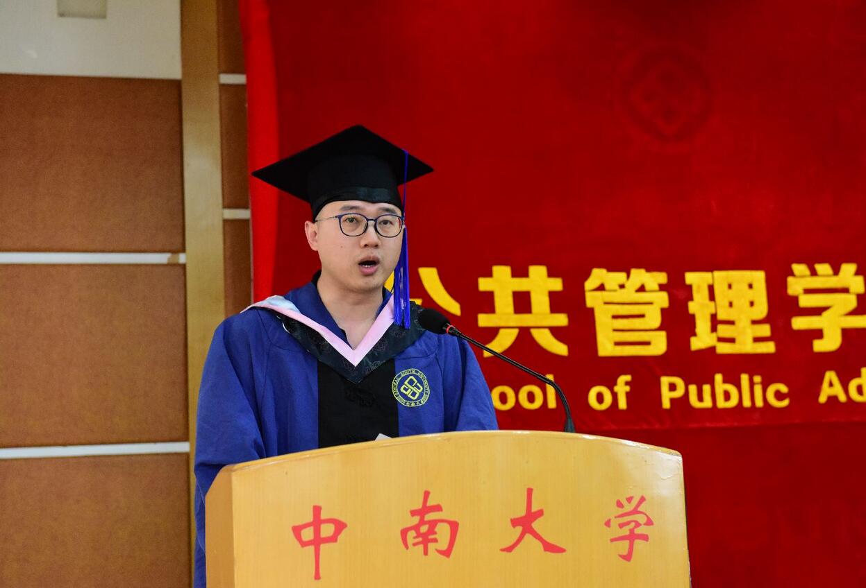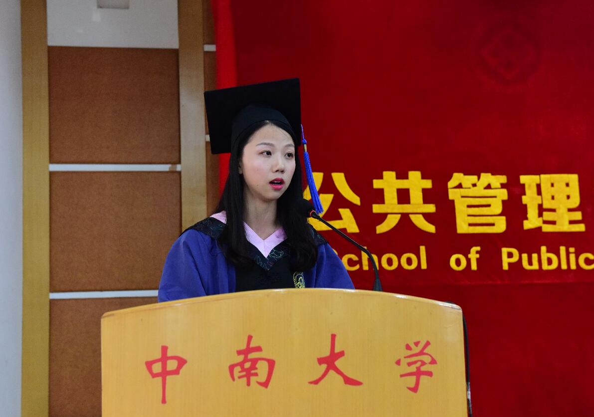 哲学系毕业生代表胡蝶花从容走上演讲台,讲述了她和中南公管的故事。她表示,仰不愧天,俯不怍人的教诲将会一直伴随着她。