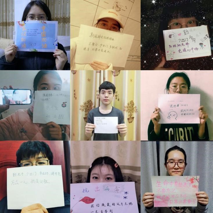 接着,围绕此次团日活动的主题展开讨论。同学们都积极讨论,体现了对疫情的关注,同时,为表达抗击疫情的决心,同学们纷纷晒出了自己在家运动、学习的图片,线上活动气氛逐渐开始热烈起来。随后,同学们用图画、手写信、手抄报、支持标语等方式,向一线抗疫人员、后方支援团队表达敬意,为疫情防控献上最温暖的的祝福,为武汉加油,为中国加油!