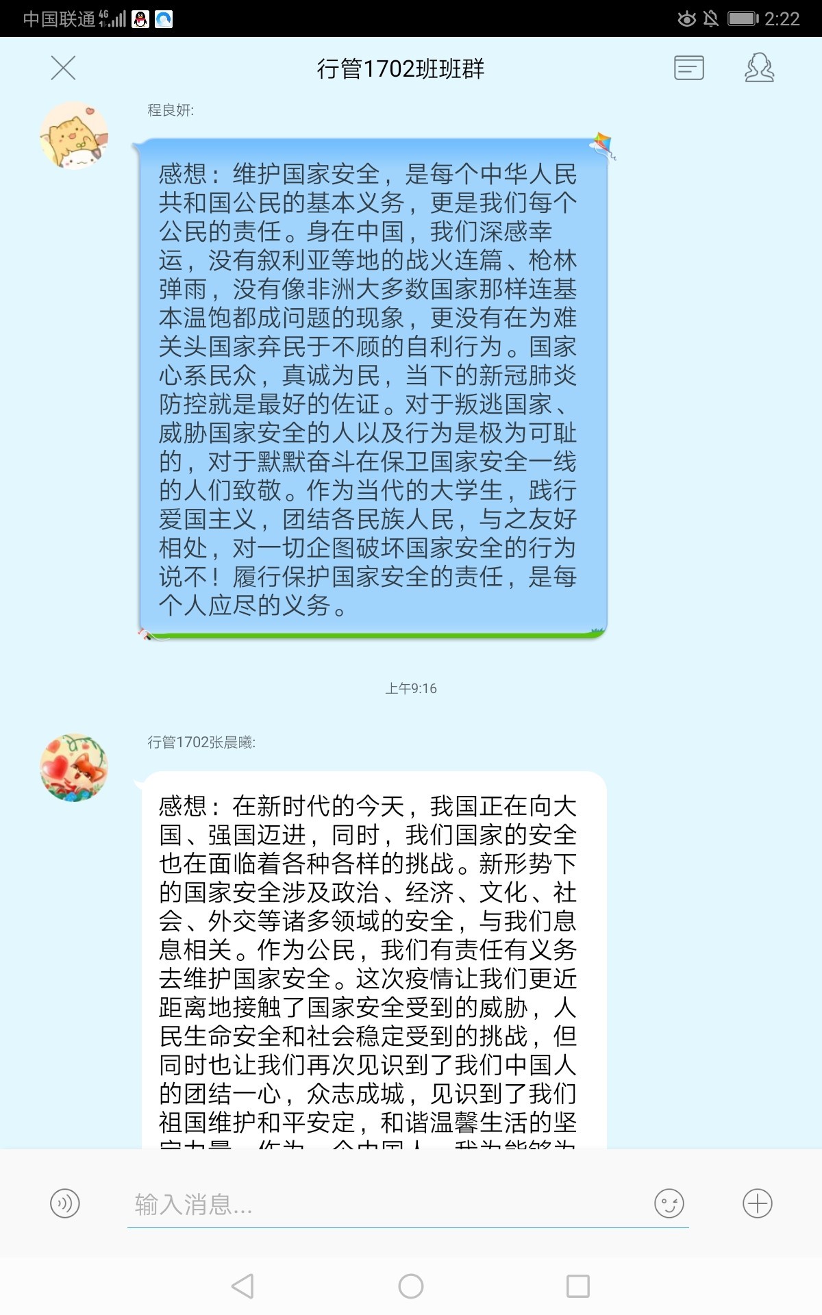 为提高同学们的国家安全意识,4月15日至17日,我院组织各班开展“全民国家安全教育日”主题活动,深入学习贯彻习近平总书记的总体国家安全观,推动国家安全宣传教育和疫情防控两手抓。此次活动以线上主题班会为主,由各班班长主持,班级全体同学积极参与。