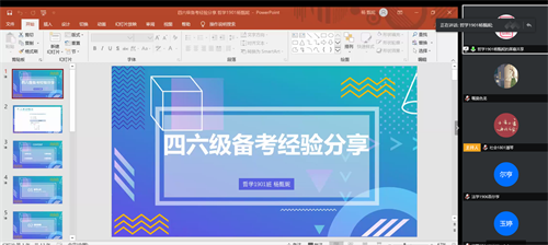 4月22日下午4时,我院在腾讯会议平台举行了英语四六级经验分享会。会议邀请本科生17、18、19级龙子航、邵翊铭、张开元、杨甄妮共4位四六级高分学霸分享经验,19级辅导员闵迪老师和19级全体同学参会,院学生会学术部部长潘琴同学主持。