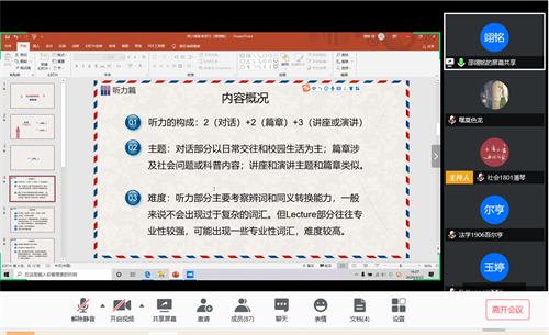 最后,主持人组织了交流提问环节,同学们热情参与。与会同学纷纷表示受益匪浅,期盼同学们能够在之后的四六级考试中取得满意的成绩。