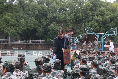随后,三院领导和分团委、学生会成员们给新生们分发了此行带去的脉动饮料。时值九月,虽然长沙气温有所下降,但新生训练辛苦,收到饮料的新生们表示非常开心,对学院领导和学长学姐们的慰问和鼓励表示感谢。