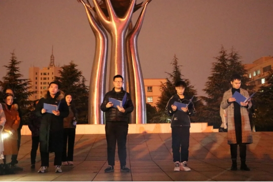 默哀结束后,院研究生代表邱铭韬、陈奕醇、雷震、曹轶骝集体朗诵《和平宣言》,深切表达了公管学子对死难同胞的哀悼与追念,并为祖国和平美好的未来祈愿。