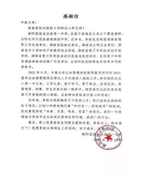 除了日常教学,杨雪艳还积极参加县级、校级的各种立项,筹备公开示范课等相关比赛,并且在校办公室有行政职位,负责宣传、接待等工作。凭借着扎实的学历背景、突出的业务能力和上进肯干的做事态度,杨雪艳获得了麻阳一中领导们的高度肯定和重视,成为了学校向外推介的一张名片。我校作为杨雪艳的母校,在2022年3月28日收到了麻阳一中专门的来信感谢。“深海是浪涛的依托,飞鸟是天空的骄傲”,杨雪艳说,作为“中南人”,她审慎着头顶的名校光环,不敢有一丝一毫的松懈,正因为有她这种角色自觉,母校才又增添了熠熠光芒。