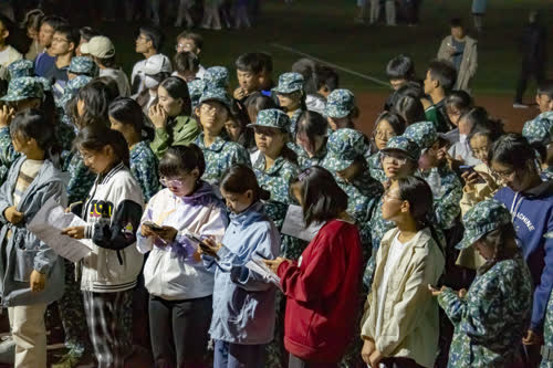 晚饭后,同学们再次回到了训练场,为即将到来的军训红歌合唱比赛而排练。《我爱你中国》的歌声动听高亢,展现着新生们对祖国无限的爱。