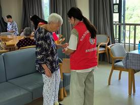 随着社会老龄化趋势的日益明显,老年人口数量不断增加,失智症患者也日益增多。敬老院作为社会福利机构,为失智老人提供了一个温馨的家园。活动伊始,“老吾老”团队的志愿者们来到了失智症患者专区——鱼忆之家认知症专区。这里居住着一些患有失智症的老人,他们有的已经忘记了家人的面孔,有的已经失去了与外界沟通的能力。志愿者们耐心地与老人们进行交谈,了解他们的生活状况和需求。尽管有时沟通会遇到挑战,但他们用温柔的话语、和煦的笑容,努力搭建起心灵的桥梁。有的老人虽然记忆模糊,但在志愿者的陪伴下,脸上绽放出久违的笑容,仿佛回到了往昔的温馨时光。志愿者们还细心地聆听老人们的故事,哪怕只是片段的回忆,也足以让在场的每一个人感受到岁月的沉淀与生命的厚重。随后,志愿者们为老人们送上了慰问品,包括水果、日用品、益智玩具等,每一份都承载着对长辈们的关怀。