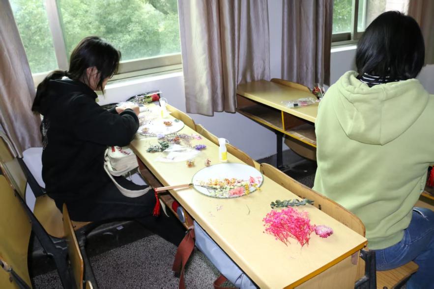 下午2时,在世纪楼A201教室开启了非遗文化体验之旅。参与者们将永生花精心布局于素白扇面,定格春日浪漫;手链编织台前,彩色玉珠随银线穿梭,串起个性时尚;螺钿发簪体验区尤为火热,参与者将贝母薄片镶嵌于木胚,感受千年非遗技艺的匠心传承。活动现场笑语不断,大家沉浸于指尖创作,一件件独具匠心的作品渐次诞生。亲手制作发簪不仅解压,更能让人体会到传统美学的精妙。