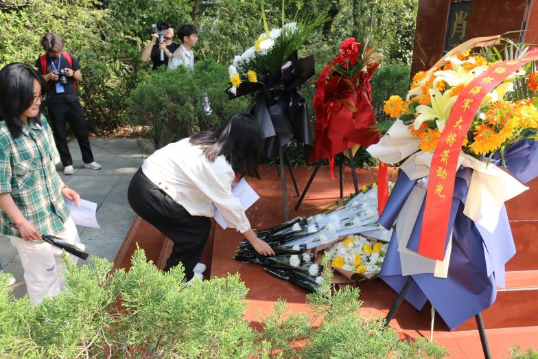 登山队伍首站抵达岳麓山肖劲光铜像纪念园。全体师生整齐列队,手持白菊齐唱国歌并进行一分钟默哀。随后,师生依次向肖劲光铜像敬献鲜花,并集体诵读《英雄祭》,表达对先烈崇高的敬意以及深切的怀念。