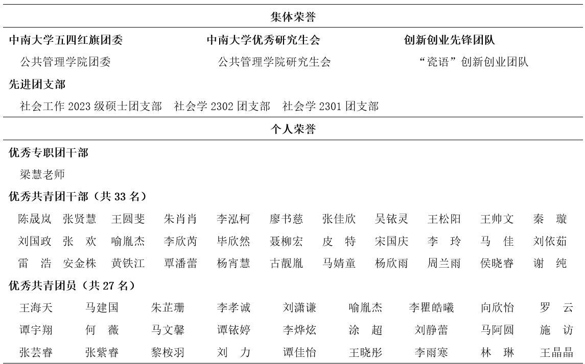 此次受到表彰的个人及集体,用实际行动展现了公管青年积极向上、奋发进取的精神面貌,为全院青年做出了榜样,树立了标杆!希望受表彰的个人和集体珍视荣誉,牢记总书记嘱托,赓续前行。展望未来,我院团学组织将以此次表彰为新起点,坚持以习近平新时代中国特色社会主义思想为指导,聚焦立德树人的根本任务,团结引领广大团员青年向模范学习、向先进看齐,以实际行动回应总书记期望——怀爱国之心、立报国之志、增强国之能,将个人理想融入民族复兴伟业,持续为全面建设社会主义现代化国家注入强劲青春动能。