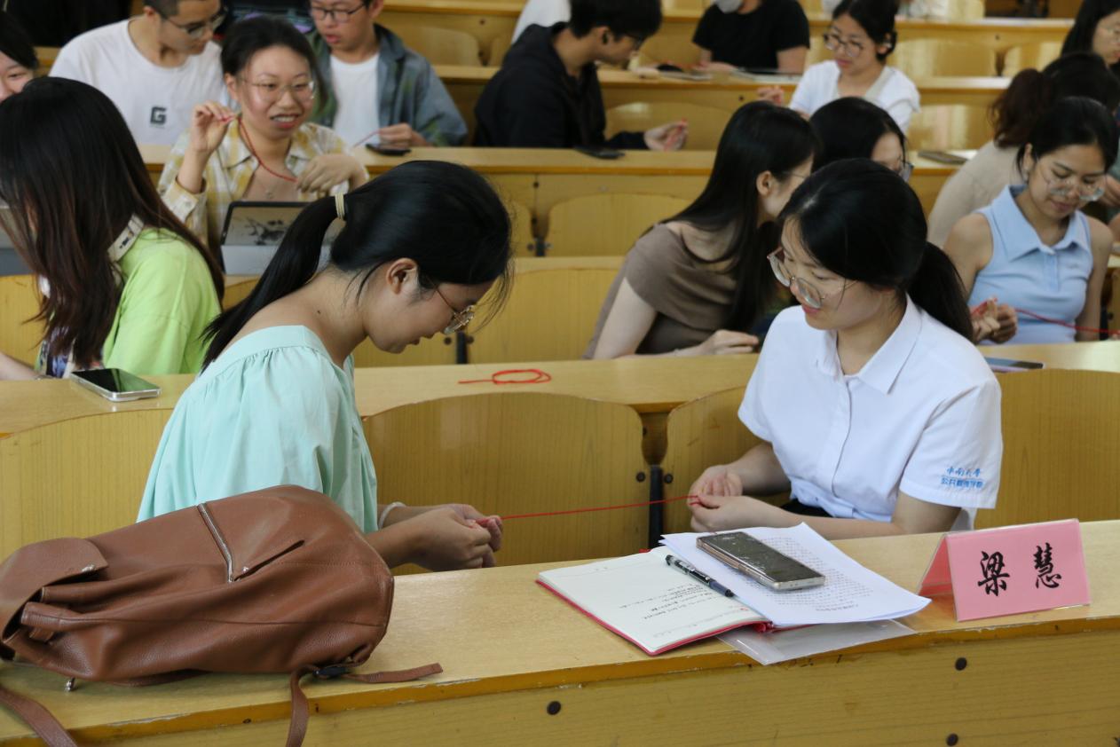 之后,活动进入动手环节,彭老师现场教授寓意驱邪避毒的五彩绳编织技艺。同学们热情参与,积极学习金刚结的编法,认真编制手链。在互动问答与亲手编织中,同学们不仅感受到手作的温度,更深刻理解了民间手工艺所蕴含的美好祈愿与生活智慧。