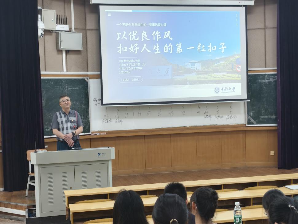 为加强毕业生廉洁教育,引导青年学生坚定理想信念、厚植家国情怀、走好人生道路,6月12日下午4时,在世纪楼C101,我院为毕业生开展了一堂题为“以优良作风扣好人生的第一粒扣子”的廉洁谈心课。学院党委副书记耿贵斌主讲课程,学院2025届全体毕业生参与。