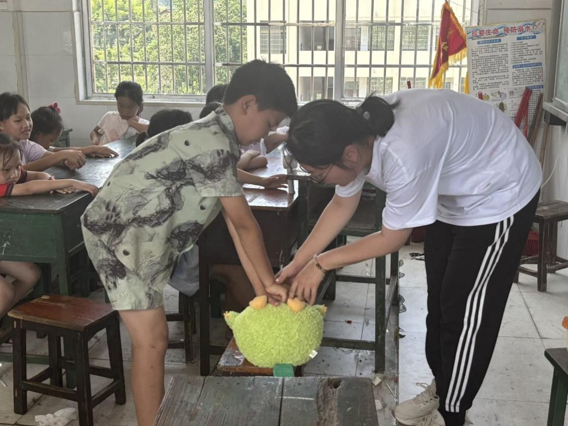 在急救技能培训课堂上,黄老师现场展示急救包内物品,逐一讲解绷带包扎等操作要领,确保小朋友能够了解核心原理。在实践环节,黄老师借助玩偶教具现场规范演示心肺复苏(CPR)的操作流程,随后孩子们分组练习CPR心肺复苏技能。课程结束后,学生们反响热烈,纷纷表示掌握了基础的急救技能,并表达“今后在必要时也能运用所学帮助他人”的意愿与信心。这堂理论与实践相结合的急救课,有效普及了生命救护知识,同时提升了学生的安全意识和应急处置能力。