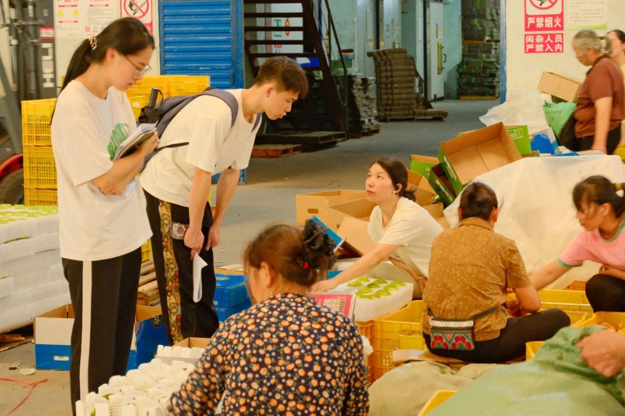 第一站是六月香果业车间,传送带上,瑶山雪梨被送上激光测距仪,0.1秒内完成分级。女工套袋、贴溯源码,一分钟就能装完一箱。同学们近距离参观了瑶山雪梨从分拣、套袋、包装到装箱的全流程,详细了解了瑶山雪梨的销售渠道、宣传策略、市场拓展、科技赋能等情况。团队成员段兆栩坤把激光分敛设备参数拍照存入手机,“原来课本里的公式真的在帮果农挣钱”。陈睿琪则把企业“旺季日发两万单”的销售数据记录下来,此刻,数字不是冷冰冰的,而是果农算得清的账。
