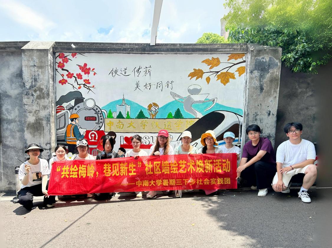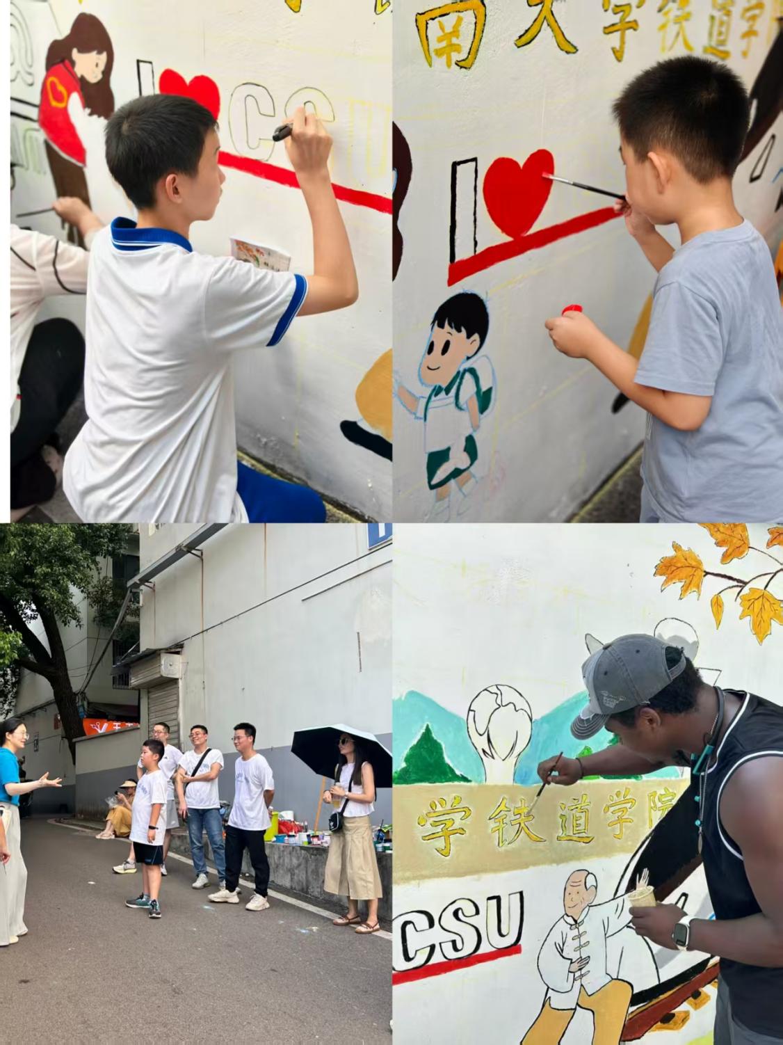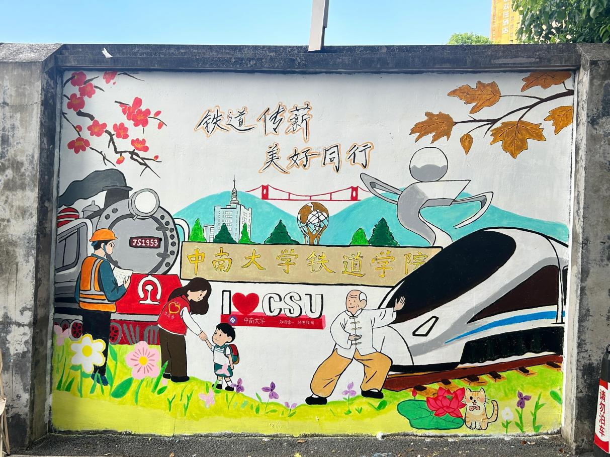 为展示校园文化底蕴,美化校园居民环境,8月4日上午,在中南大学铁道管委会和中南大学轨道交通科普基地的支持下,“共绘梅岭,巷见新生”暑期实践团以“铁道传薪,美好同行”为主题,中南大学天心校区东二门附近墙面,完成了一幅融合铁道历史、校园记忆与社区烟火气的墙绘作品。这幅由大学生志愿者、社区居民等多方共创的艺术作品,不仅美化了社区环境,更成为“艺术赋能社区治理”的创新实践。