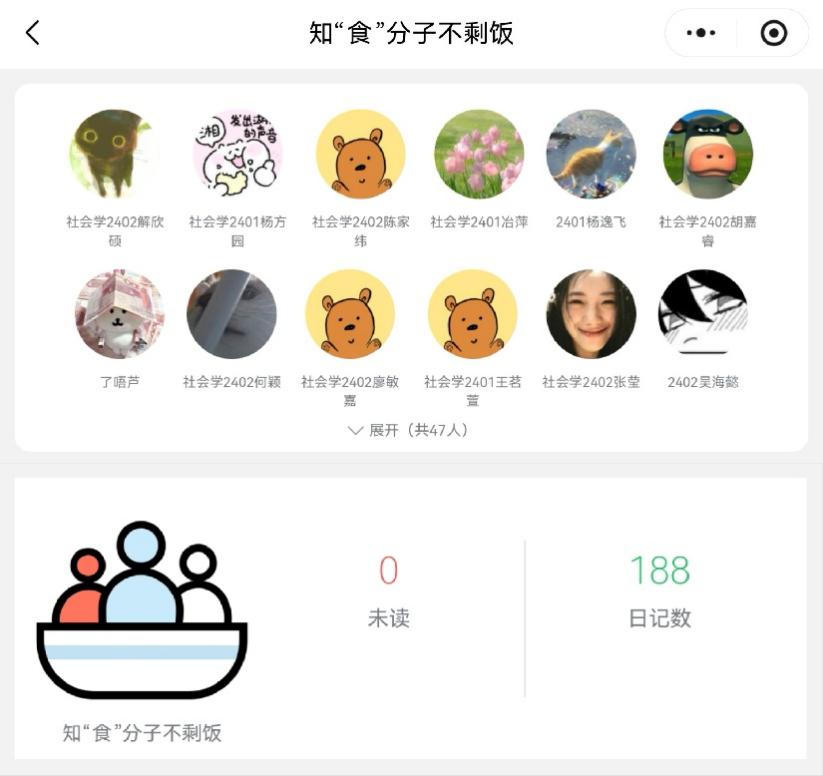 本次团日活动创新形式,依托小程序平台,组织两班同学以每日打卡的方式,上传每餐“光盘”照片,记录并分享节约实践。期间,同学们认真践行光盘行动,踊跃分享节约成果。其中,杨方园、胡馨雯、何颖等同学分享“光盘”次数超7次,两班总计打卡分享次数186次。在持续的打卡互动中,不仅强化了同学们的个人节约习惯,也在班级间营造了“爱粮节粮、人人有责”的良好氛围。