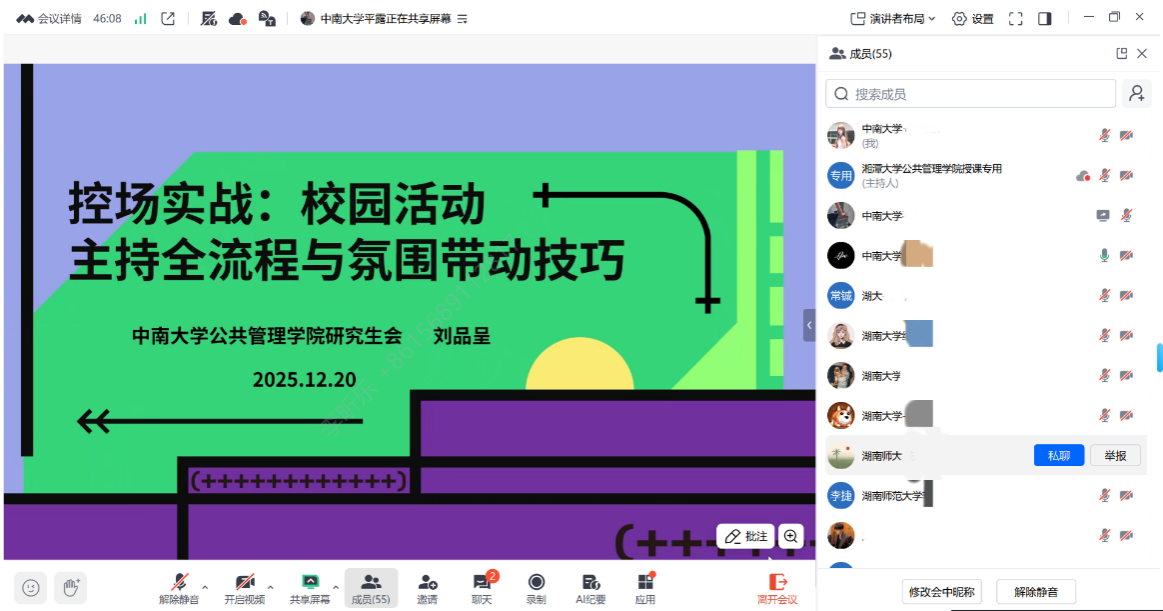 我院研究生会副主席刘品呈以《控场实战:校园活动主持全流程与氛围带动技巧》为题,围绕开场破冰、环节衔接、声音运用及突发应对等多个维度,系统分享了主持背后的“软实力”。分享中既有“478呼吸法”“自问三句法”等实用技巧,更点明主持的本质在于“连接与营造”,增强参与者的的仪式感与归属感。该内容实操性强、观点鲜明,获得了兄弟院校同仁的积极反响。
