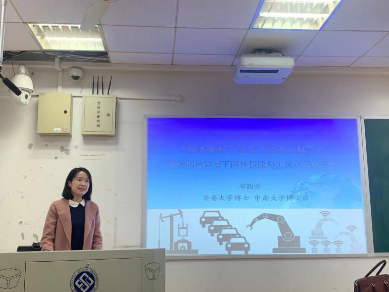 10月22日下午,由中南大学科研部主办、我院研究生会承办的中南讲堂·人文论坛系列讲座之“技术赋权”还是“技术父权”?——智能制造背景下两性技能和工资水平的差异,在科教北楼406室举行。本次讲座由我院李斌教授主持,我院博士后邓韵雪老师应邀担任本次论坛的主讲嘉宾,我院社会学系主任潘泽泉教授、彭远春副教授、颜敏副教授、谢新华副教授、博士生、研究生及本科生均聆听了此次讲座。