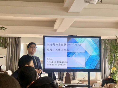 11月27日下午,由中南大学科学研究部主办,我院研究生会承办的中南讲堂·人文论坛系列讲座之“做有趣的量化社会科学研究:选题、写作与发表”在升华后楼十楼和谐阁举行。广州大学社会学系副教授、硕士生导师、日本九州大学社会学博士、广州大学“百人计划” 杰出青年引进人才李双龙副教授应邀担任本次论坛的主讲嘉宾。我院社会学系董海军教授、刘惠颖教授、颜敏副教授、彭远春副教授,博士生、研究生聆听了此次讲座。由我院副院长董海军教授主持。