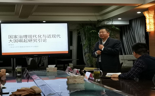 1月3日晚上,由中南大学科学人事处、科学研究部主办,我院研究生会承办的中南讲堂?名师名家论坛之“国家治理现代化与近现代大国崛起问题研究”在yl23455永利官网和谐阁举行。北京大学中国政治学研究中心何增科教授应邀担任本次论坛的主讲嘉宾。我院副院长许源源教授、副院长姜国俊副教授、刘媛副教授以及欧阳万福副教授、研究生聆听了此次讲座。本次讲座由我院副院长许源源教授主持。