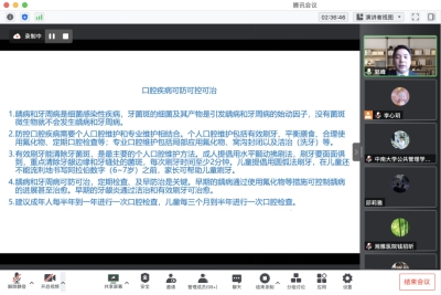 2022年5月21日上午10:00,由中南大学湘雅医院郭峰教授主讲的《口腔健康,健康“门户”》讲座在腾讯会议召开,本次讲座为湖南省2021年第九批创新型省份建设专项资金项目“重大公共卫生事件应急知识普及体系构建研究”(项目编号:2021ZK4151)系列讲座的第二场,由我院周谨平教授主持,共计130余位老师和同学线上聆听了此次讲座。